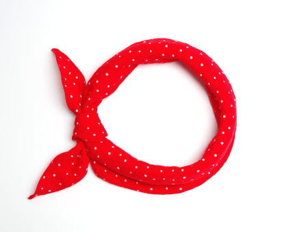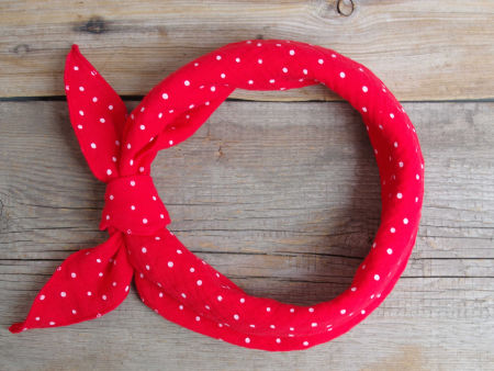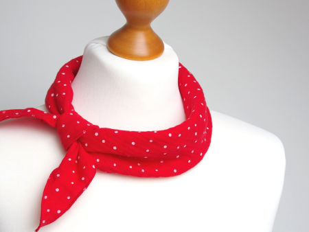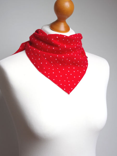 Apaszka, chusteczka z muślinu w kolorze czerwonym. Chustka, bandana jest trójkątnego kształtu, na zdjęciu jest zrolowana. Będzie ciekawym dodatkiem do wiosennych i letnich stylizacji.