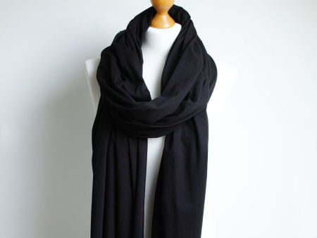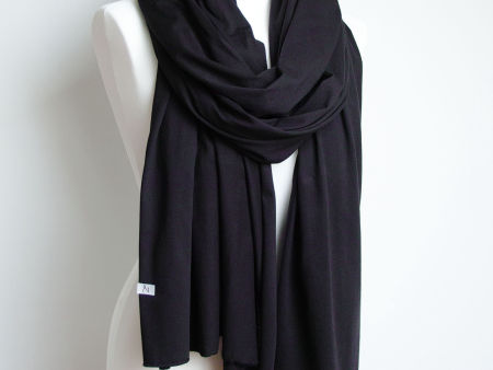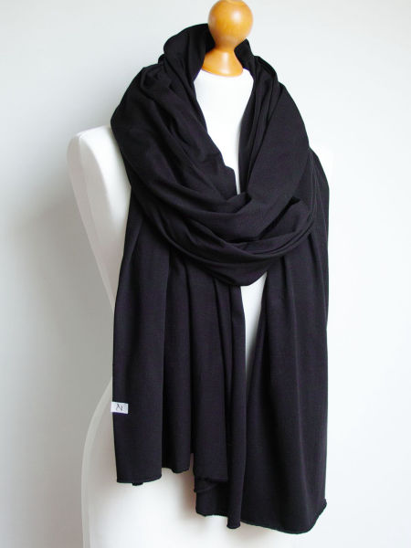 Duży szal z dzianiny bawełnianej w kolorze czarnym. Szal jest miły i miękki w dotyku, bardzo ładnie się układa. Szal uszyty został wysokogatunkowej bawełny. Brzegi zostały obszyte maszynowo, estetycznie wykończone. Dodatkowo opatrzony jest naszą firmową metką.