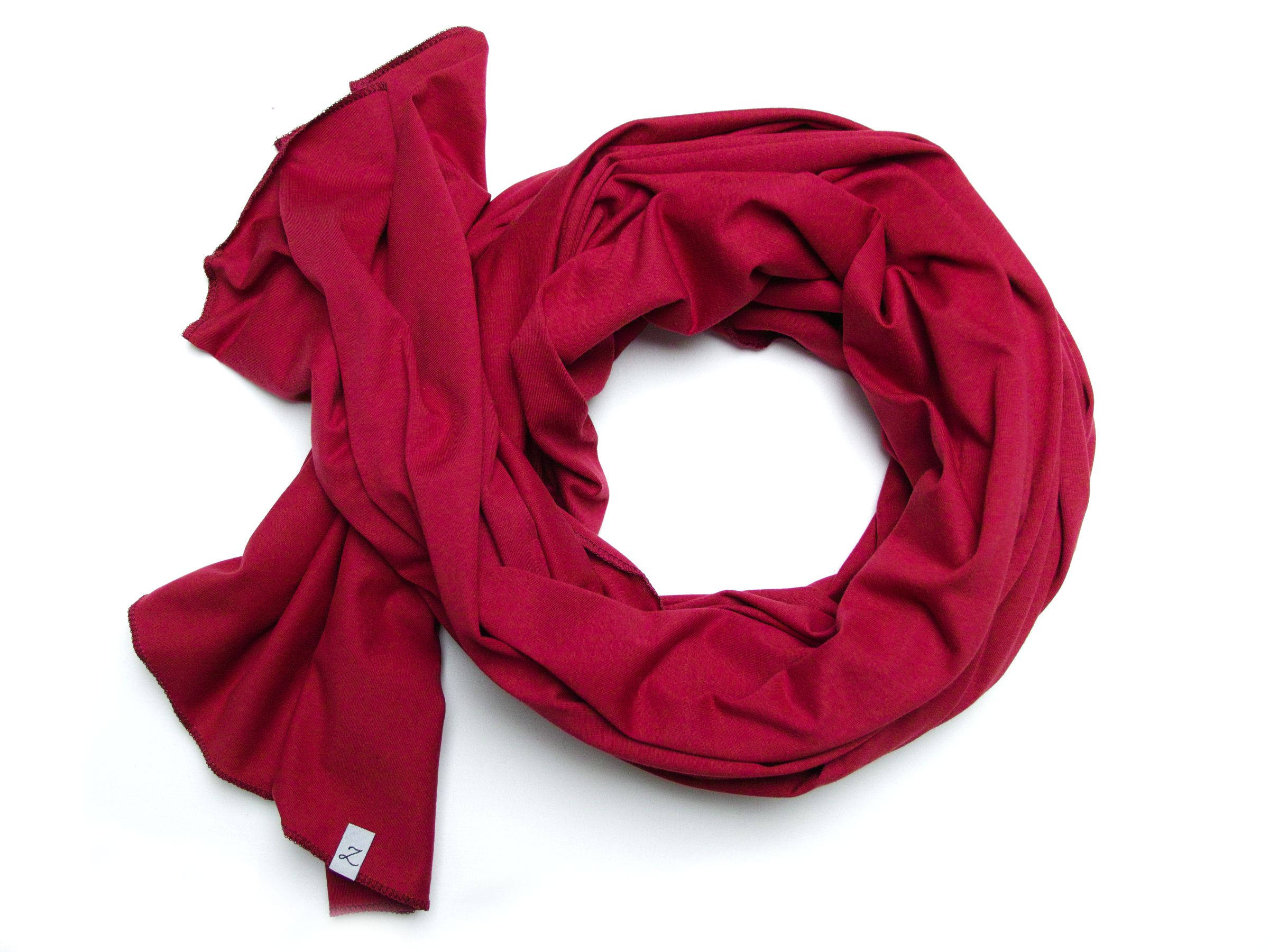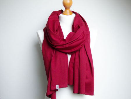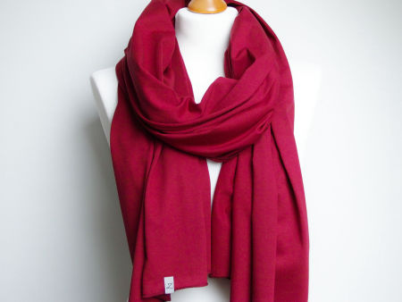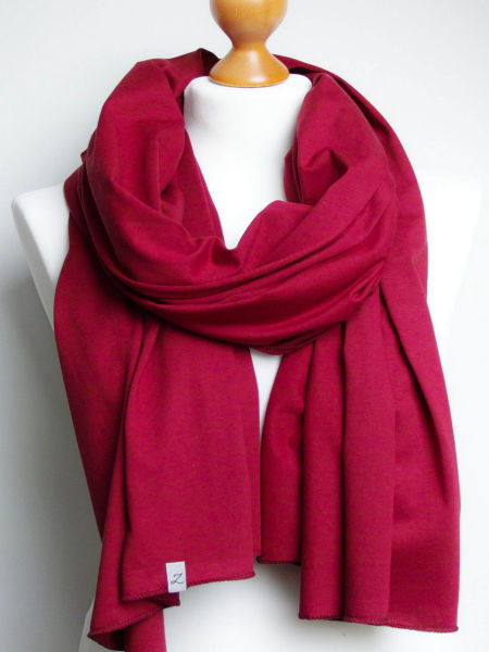 Duży szal z dzianiny bawełnianianej w kolorze bordowym. Szal jest miły i miękki w dotyku, dobrze się układa. Szal uszyty został z wysokogatunkowej delikatnej bawełny. Brzegi zostały obszyte maszynowo, estetyczne wykończenie.
