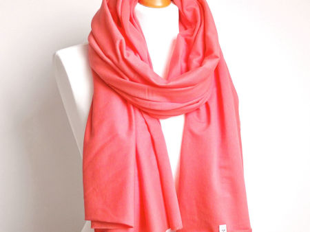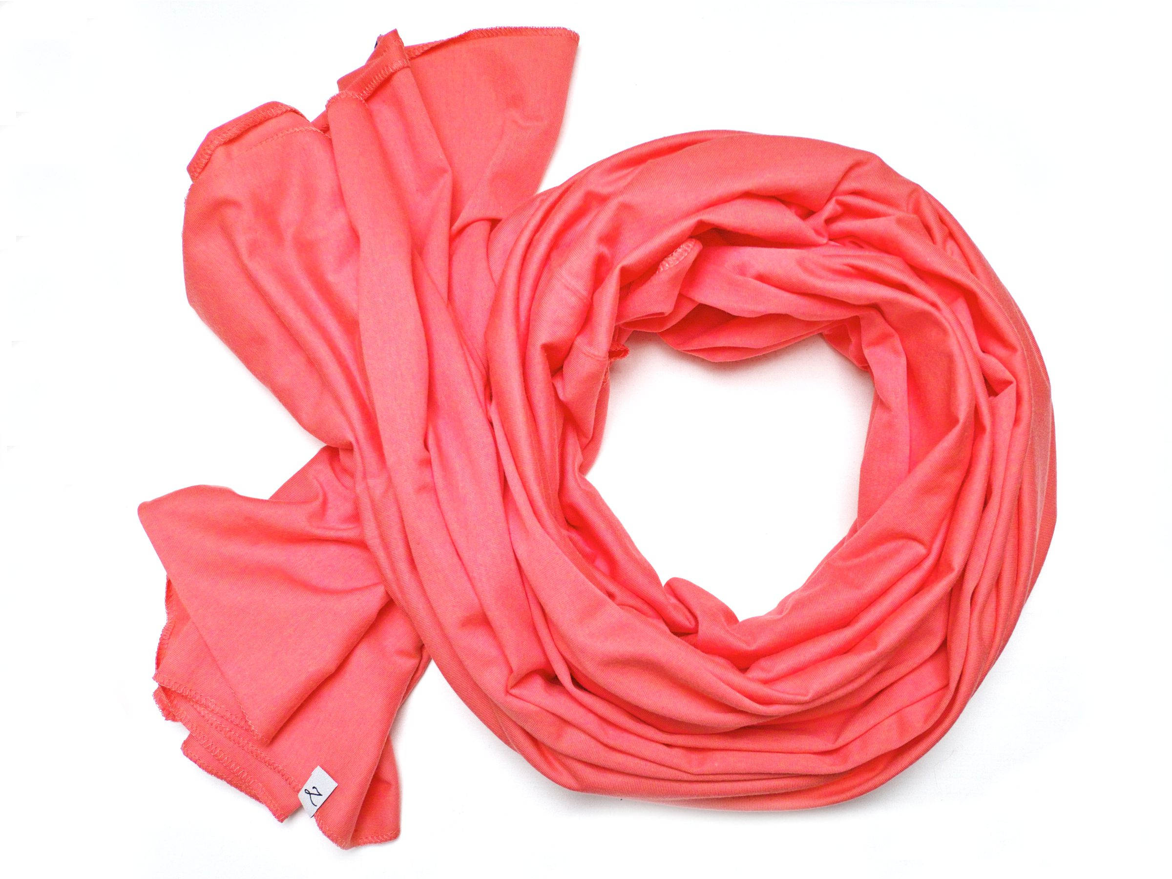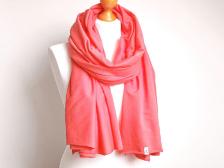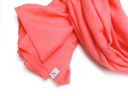 Duży szal z dzianiny bawełnianej w kolorze koralowym. Szal jest miły i miękki w dotyku, dobrze się układa. Szal uszyty został z wysokogatunkowej delikatnej bawełny. Brzegi zostały obszyte maszynowo, estetyczne wykończenie.