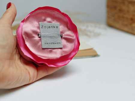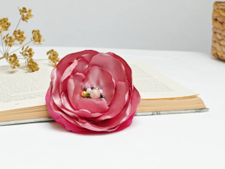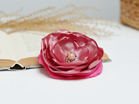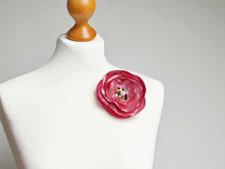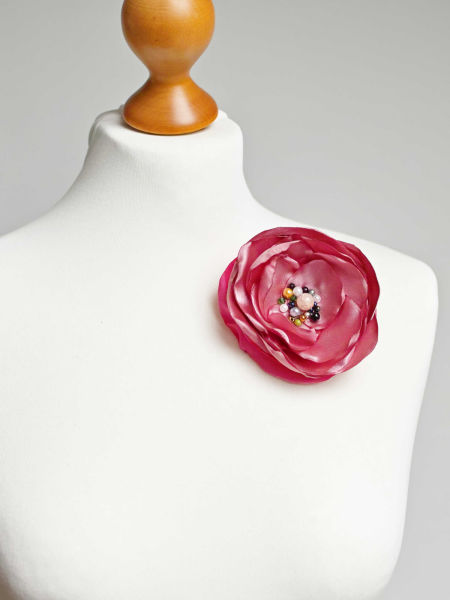 Elegancka broszka, kwiatek ręcznie wykonana z satyny i organzy, dodatkowo ozdobiona małymi koralikami. Bardzo efektowny dodatek do marynarki, komina, sukienki, itd. Kwiatek posiada zapięcie broszkowe.