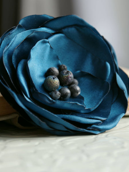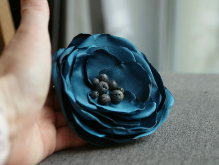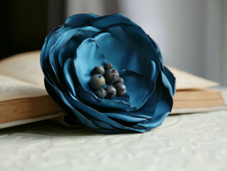Elegancka broszka, kwiatek ręcznie wykonana z satyny i organzy, dodatkowo ozdobiona małymi koralikami. Bardzo efektowny dodatek do marynarki, komina, sukienki, itd. Kwiatek posiada zapięcie broszkowe.