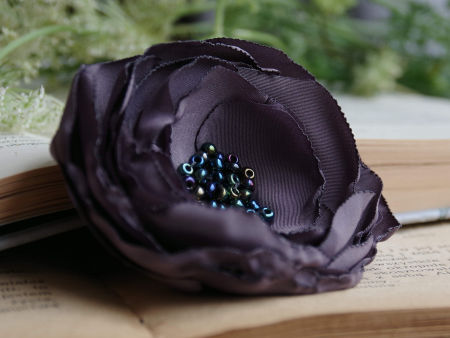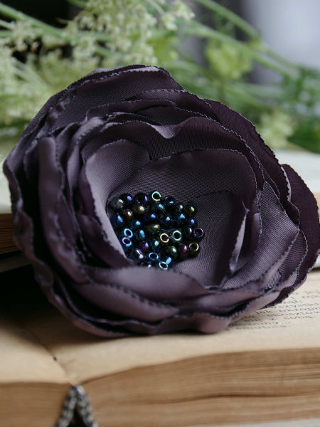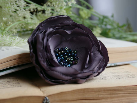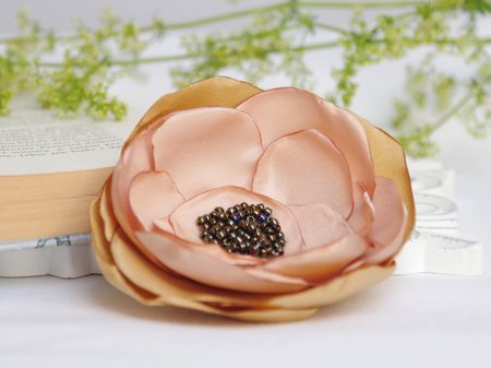Elegancka broszka, kwiatek ręcznie wykonana z satyny i organzy, dodatkowo ozdobiona małymi koralikami. Bardzo efektowny dodatek do marynarki, komina, sukienki, itd. Kwiatek posiada zapięcie broszkowe.
