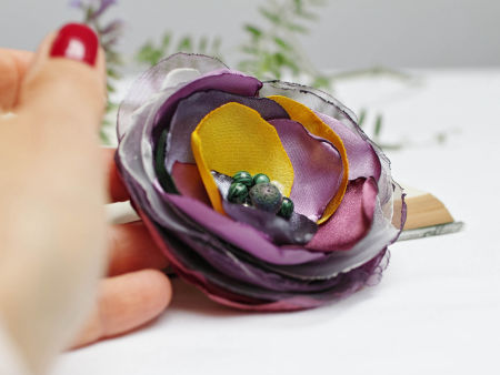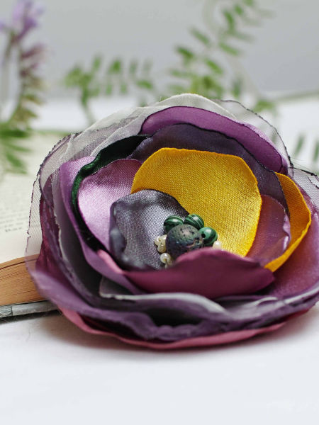 Elegancka broszka kwiatek ręcznie wykonana z satyny, dodatkowo ozdobiona małymi koralikami. Bardzo efektowny dodatek do marynarki, sukienki, itd. Kwiatek posiada zapięcie broszkowe.