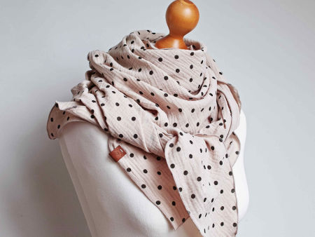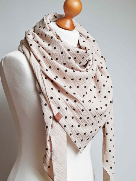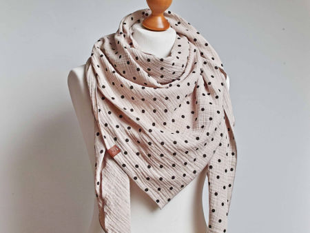Miękka chusta z muślinu w kolorze jasnego beżu w czarne kropki. Trójkątna chusta damska jest idealna na wiosnę i jesień, doskonale sprawdzi się jako miękki otulacz na szyję.