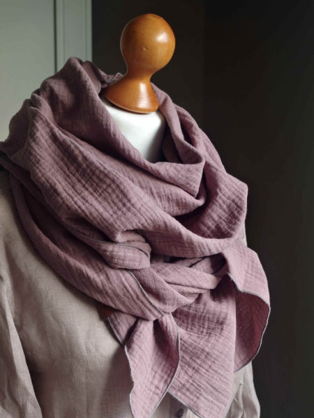 Chusta uszyta została z delikatnego muślinu dwuwarstwowego, bawełnianego.