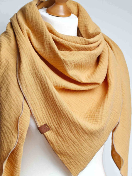 Miękka chusta z muślinu w kolorze żółtym - miodowym. Trójkątna chusta damska jest idealna na wiosnę i jesień, doskonale sprawdzi się jako miękki otulacz na szyję.