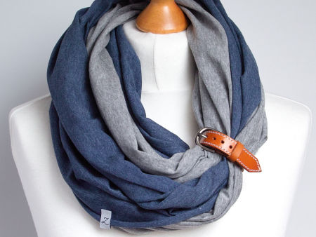 Dodatkową ozdobą jest wąska skórzana zapinka, która dodaje uroku oraz daje wiele możliwości upinania komina. Zapinkę można nosić osobno, do innego szala, ale również jako ciekawą bransoletkę na ręku.