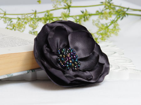 Elegancka broszka-przypinka, kwiatek ręcznie wykonana z satyny, dodatkowo ozdobiona małymi koralikami. Broszka to bardzo efektowny dodatek do marynarki, komina, sukienki, itd. Kwiatek posiada zapięcie broszkowe.