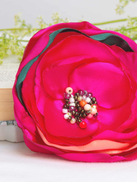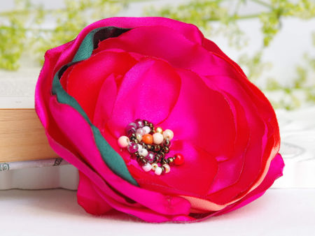 Elegancka broszka, kwiatek ręcznie wykonana z satyny, dodatkowo ozdobiona małymi koralikami. Bardzo efektowny dodatek do marynarki, komina, sukienki, itd. Kwiatek posiada zapięcie broszkowe.