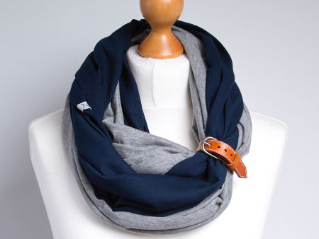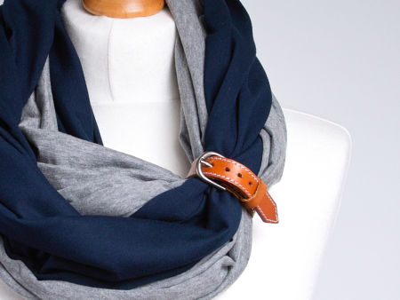 Dodatkową ozdobą jest wąska skórzana zapinka, która dodaje uroku oraz daje wiele możliwości upinania komina. Zapinkę można nosić osobno, do innego szala, ale również jako ciekawą bransoletkę na ręku.
