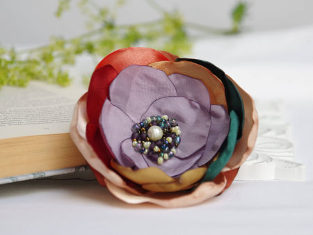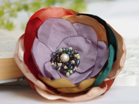 Elegancka broszka, kwiatek ręcznie wykonana z satyny i organzy, dodatkowo ozdobiona małymi koralikami. Bardzo efektowny dodatek do marynarki, komina, sukienki, itd. Kwiatek posiada zapięcie broszkowe.