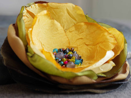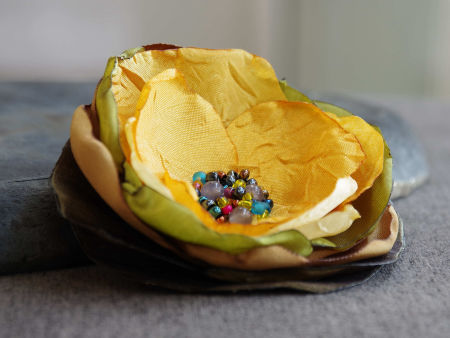 Elegancka broszka, kwiatek ręcznie wykonana z satyny i organzy, dodatkowo ozdobiona małymi koralikami. Bardzo efektowny dodatek do marynarki, komina, sukienki, itd. Kwiatek posiada zapięcie broszkowe.
