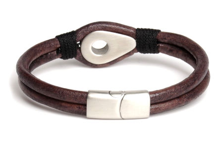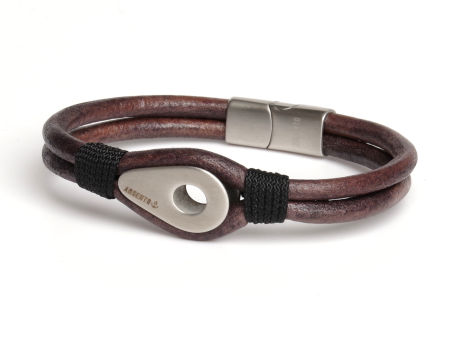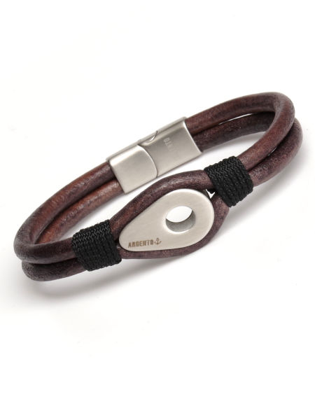 Bransoleta męska wykonana z naturalnego rzemienia w kolorze szaro/brązowym zamocowaną kauszą między rzemienie.