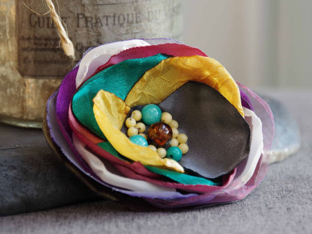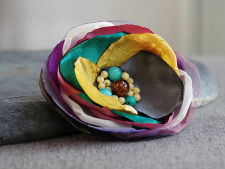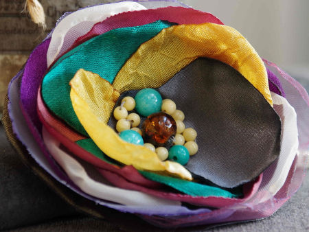 Elegancka broszka, kwiatek ręcznie wykonana z satyny i organzy, dodatkowo ozdobiona małymi koralikami. Bardzo efektowny dodatek do marynarki, komina, sukienki, itd. Kwiatek posiada zapięcie broszkowe.