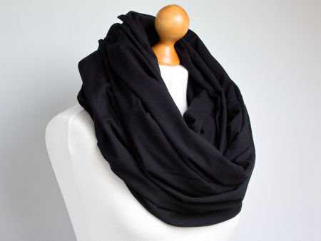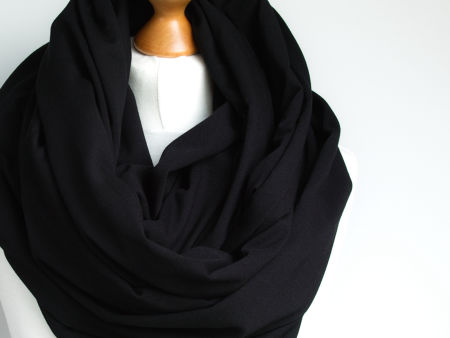 Obszerny komin dzianinowy w kolorze czarnym, uszyty z cienkiej dzianiny bawełnianej. Komin nadaje się na okres jesienny i zimowy. Pasuje praktycznie do wszystkiego. Ładnie się drapuje i układa. Można go nosić dwukrotnie owinięty wokół szyi - wtedy jest luźny i obszerny. Szeroki, można zarzucić go na głowę i będzie chronił przed mrozem.