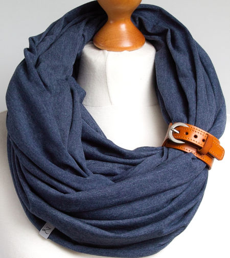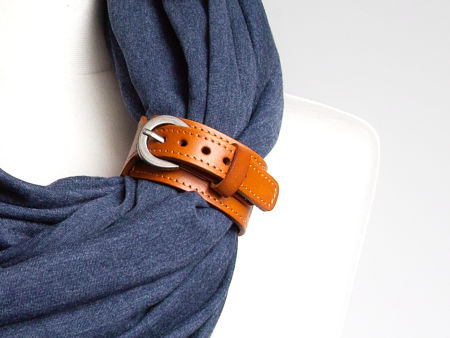 Dodatkową ozdobą jest skórzana zapinka w kolorze camel, która dodaje uroku oraz daje wiele możliwości upinania komina. Zapinkę można nosić osobno, np. do innego szala, ale również jako ciekawą bransoletkę na ręku.