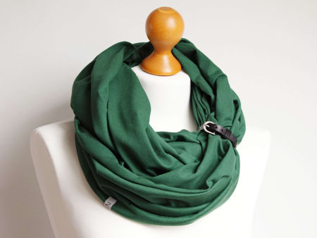 Dodatkową ozdobą jest skórzana zapinka w kolorze czarnym, która dodaje uroku oraz daje wiele możliwości upinania komina. Zapinkę można nosić osobno, np. do innego szala, ale również jako ciekawą bransoletkę na ręku.