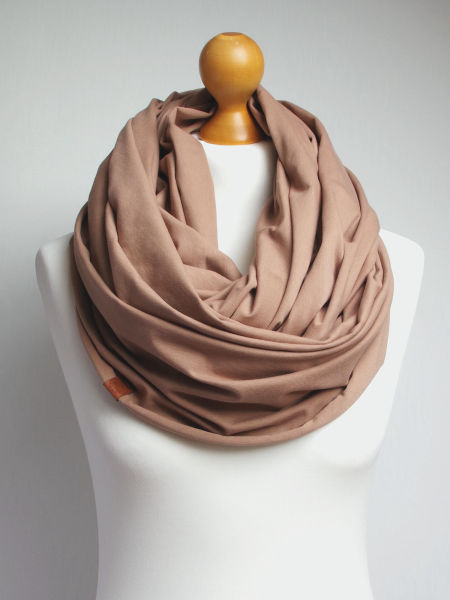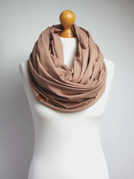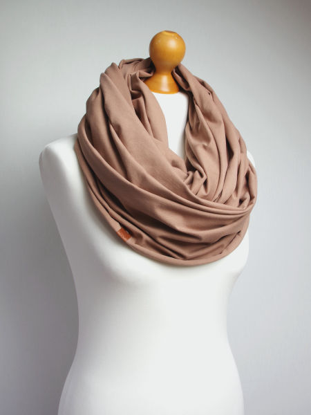 Obszerny komin dzianinowy w kolorze beżowym, uszyty z cienkiej dzianiny bawełnianej. Komin nadaje się na okres wiosenny i jesienny. Pasuje praktycznie do wszystkiego. Ładnie się drapuje i układa. Można go nosić dwukrotnie owinięty wokół szyi - wtedy jest luźny i obszerny.