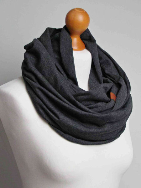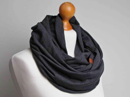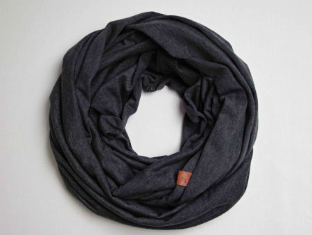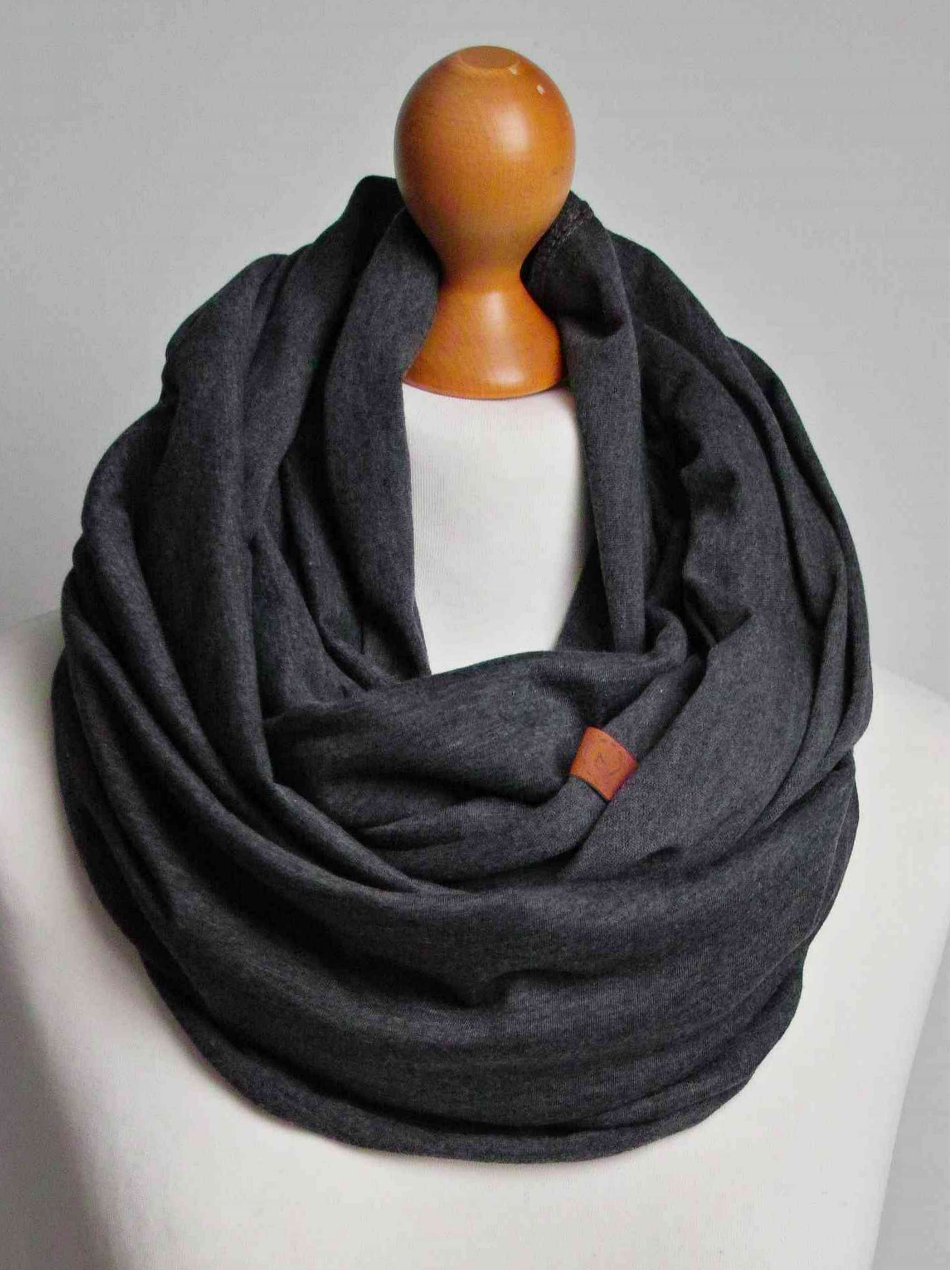 Obszerny komin dzianinowy w kolorze grafitowym, uszyty z cienkiej dzianiny bawełnianej. Komin nadaje się na okres wiosenny i jesienny. Pasuje praktycznie do wszystkiego. Ładnie się drapuje i układa. Można go nosić dwukrotnie owinięty wokół szyi - wtedy jest luźny i obszerny.