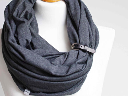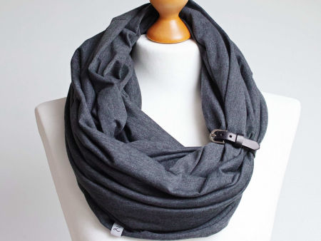 Dodatkową ozdobą jest skórzana zapinka w kolorze czarnym, która dodaje uroku oraz daje wiele możliwości upinania komina. Zapinkę można nosić osobno, do innego szala, ale również jako ciekawą bransoletkę na ręku.