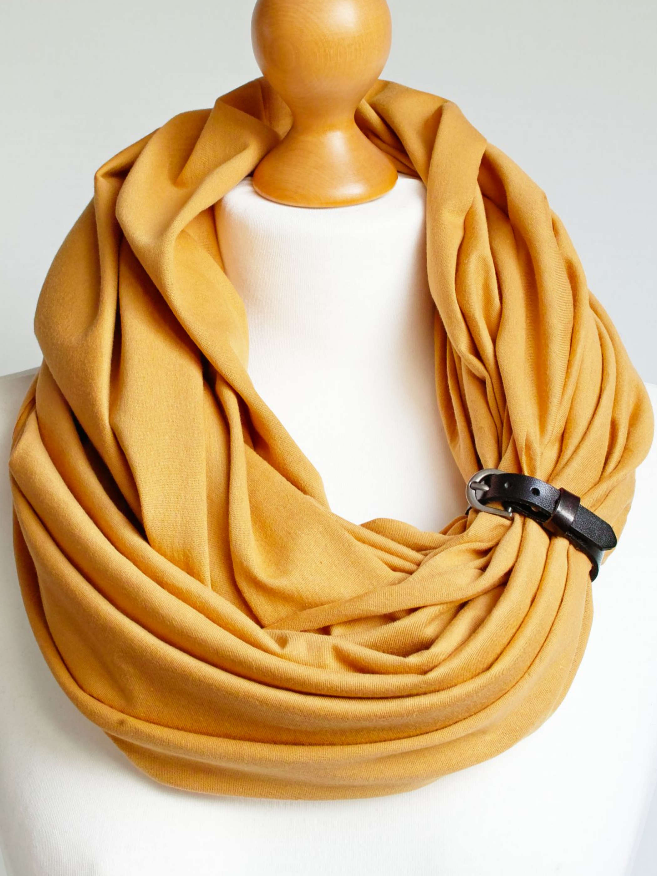 Komin dzianinowy w kolorze miodowym, uszyty z cienkiej dzianiny bawełnianej. Komin nadaje się na okres wiosenny i jesienny. Pasuje praktycznie do wszystkiego. Ładnie się drapuje i układa. Można go nosić dwukrotnie owinięty wokół szyi.