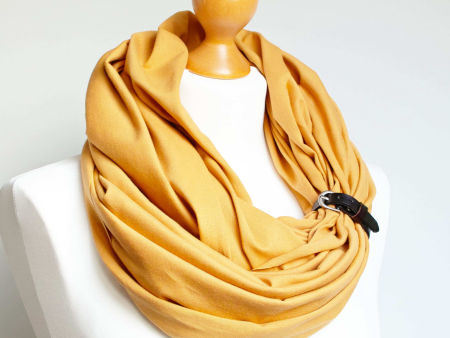 Dodatkową ozdobą jest skórzana zapinka w kolorze ciemnego brązu, która dodaje uroku oraz daje wiele możliwości upinania komina. Zapinkę można nosić osobno, np. do innego szala, ale również jako ciekawą bransoletkę na ręku.