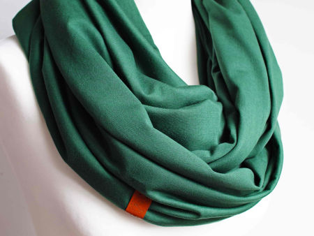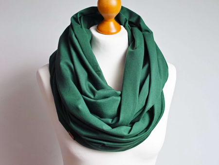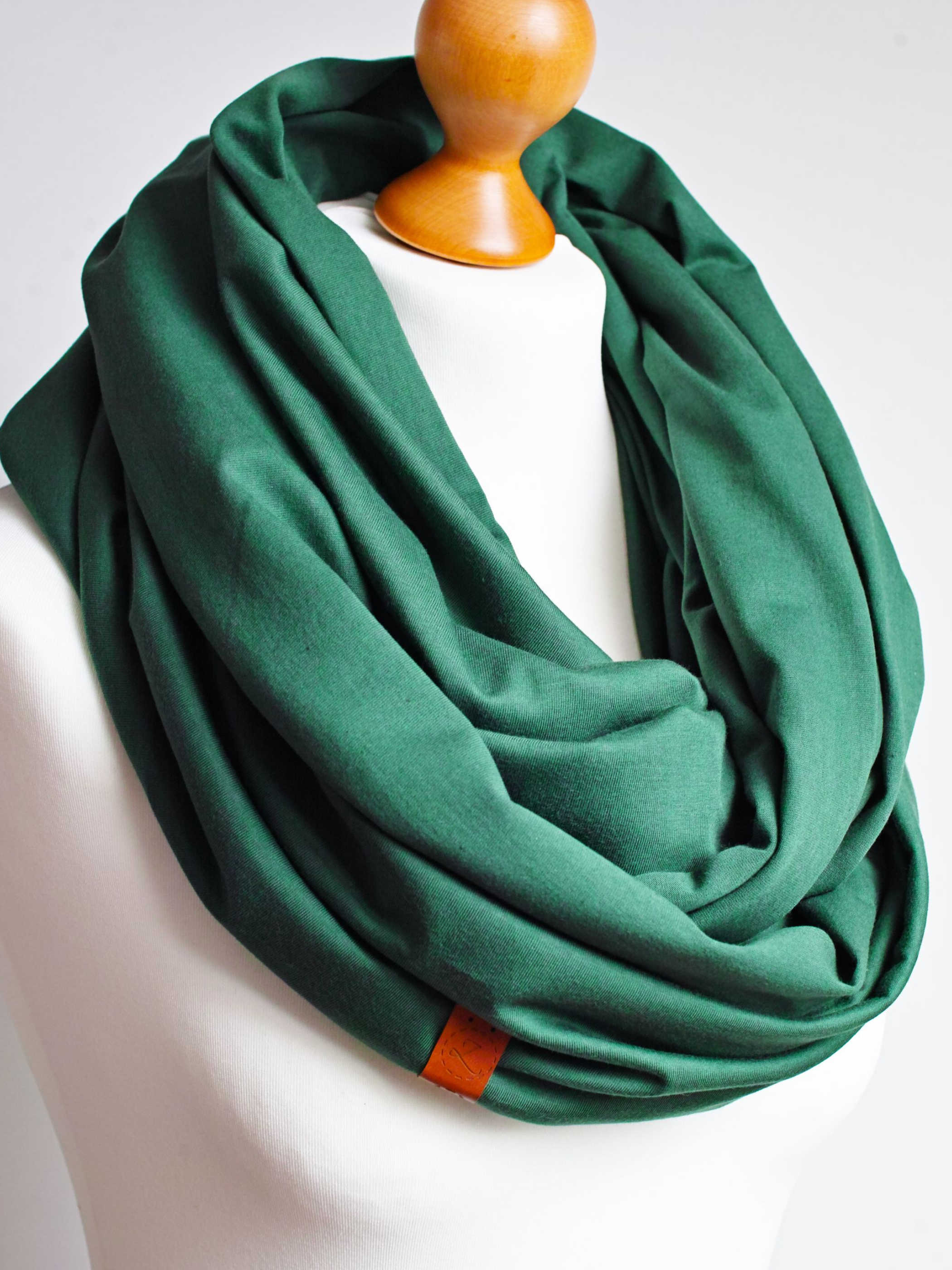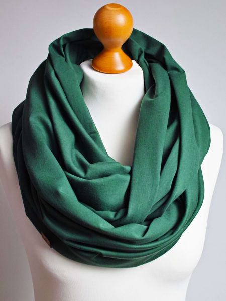 Obszerny komin dzianinowy w kolorze zielonym, uszyty z cienkiej dzianiny bawełnianej. Komin nadaje się na okres wiosenny i jesienny. Pasuje praktycznie do wszystkiego. Ładnie się drapuje i układa. Można go nosić dwukrotnie owinięty wokół szyi - wtedy jest luźny i obszerny.