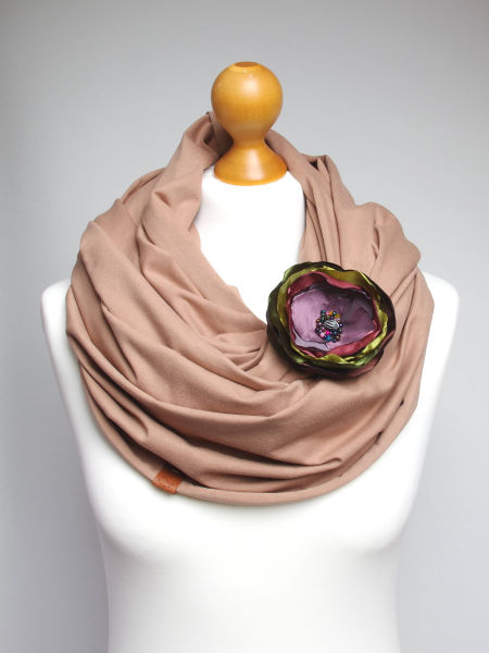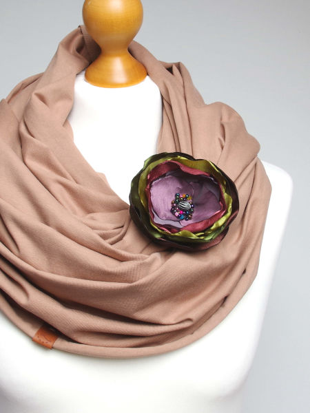 Dodatkową ozdobą jest broszka w formie kwiatu, która dodaje uroku oraz daje wiele możliwości upinania komina. Broszkę można nosić osobno, do innego szala.