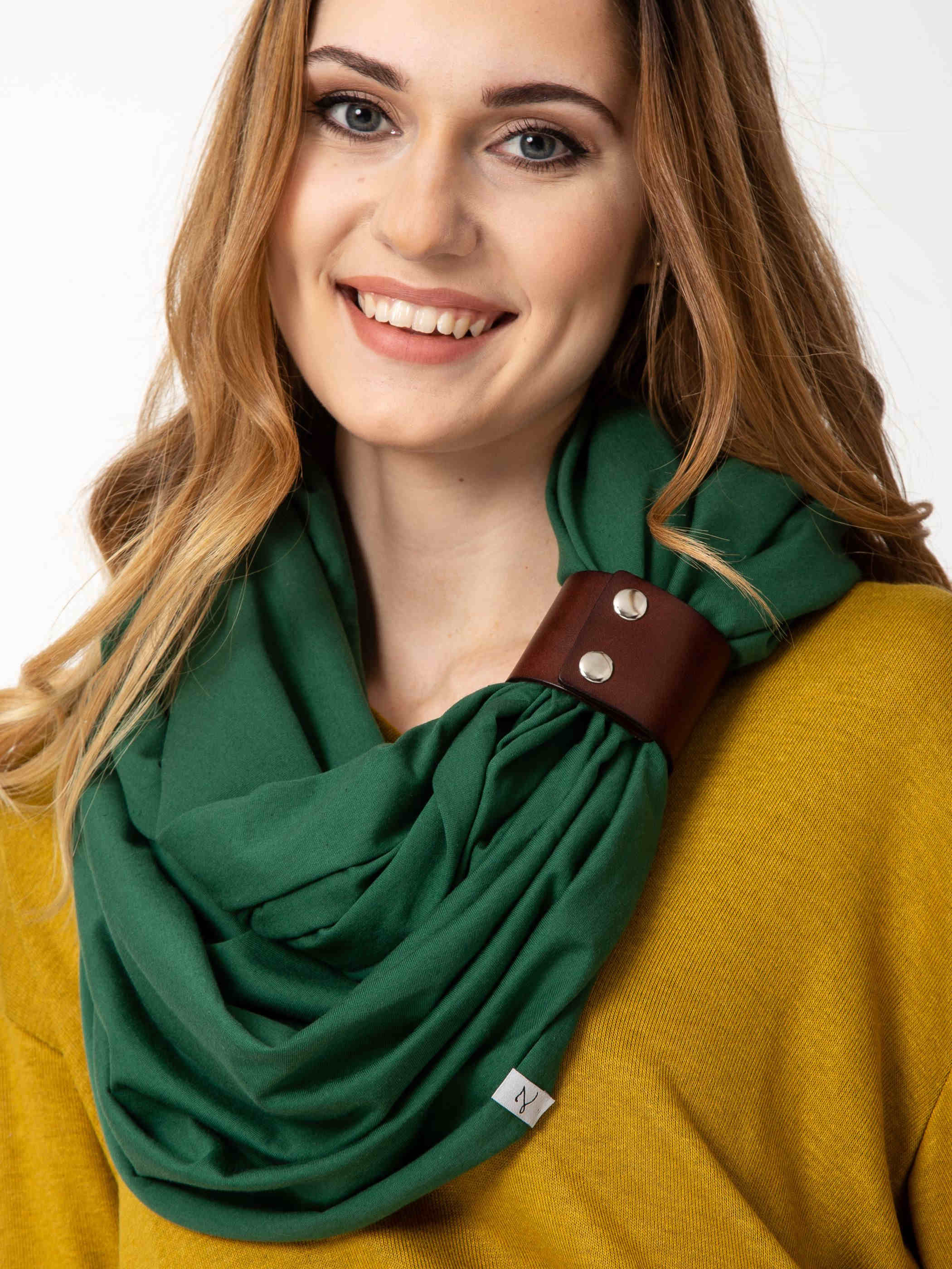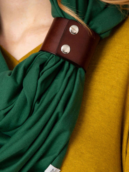 Dodatkową ozdobą jest skórzana zapinka w kolorze ciemnego brązu, która dodaje uroku oraz daje wiele możliwości upinania komina. Zapinkę można nosić osobno, do innego szala, ale również jako ciekawą bransoletkę na ręku.