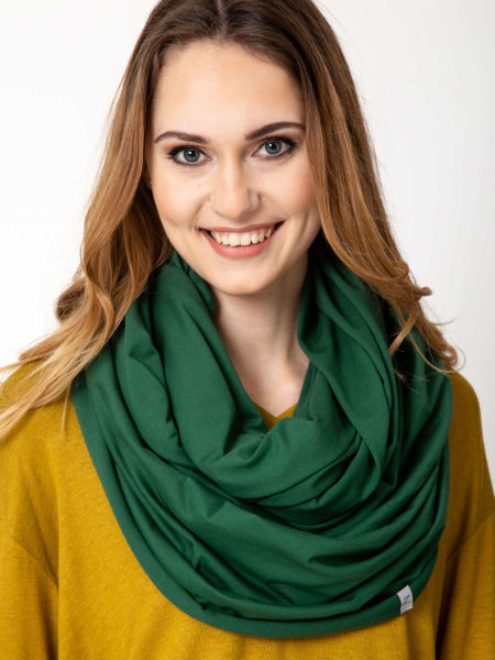 Obszerny damski komin dzianinowy w kolorze zielonym, uszyty z cienkiej dzianiny bawełnianej. Komin nadaje się na okres wiosenny i jesienny. Pasuje praktycznie do wszystkiego. Ładnie się drapuje i układa. Komin można nosić dwukrotnie owinięty wokół szyi - wtedy jest luźny i obszerny.