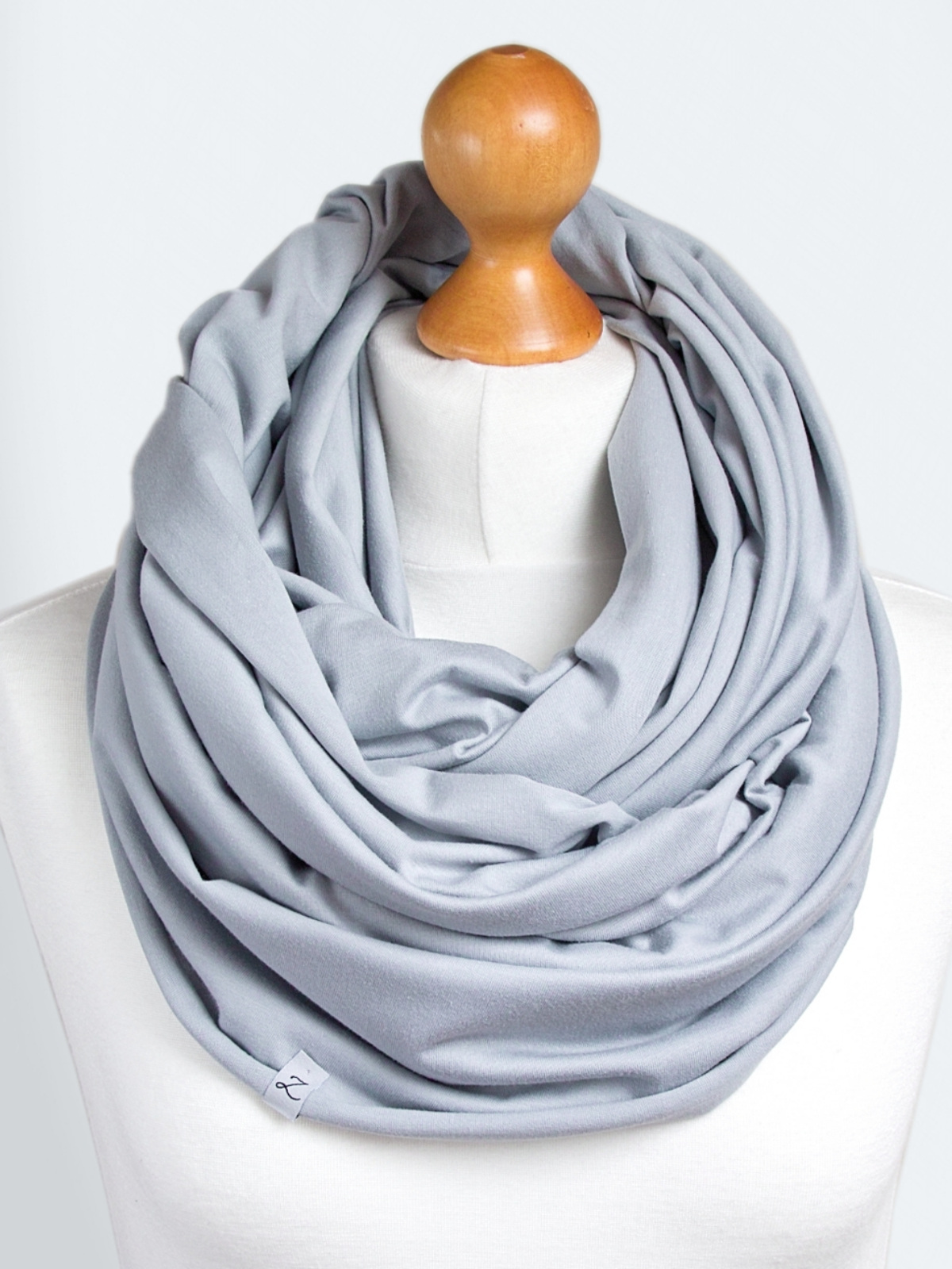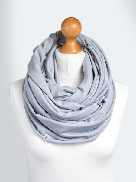 Cienki i delikatny komin dzianinowy w kolorze popielatym, uszyty z dzianiny bawełnianej. Komin nadaje się na okres wiosenny, letni i jesienny. Pasuje praktycznie do wszystkiego.