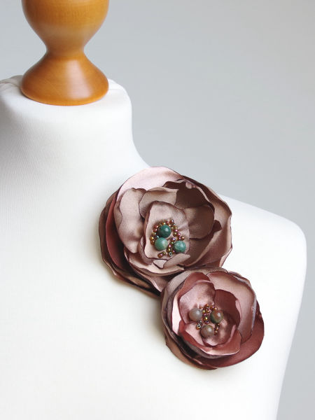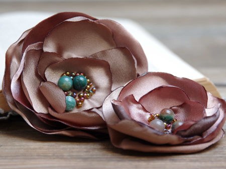 Eleganckie broszki kwiatek ręcznie wykonane z satyny, dodatkowo ozdobiona małymi koralikami. Bardzo efektowny dodatek do marynarki, sukienki, itd. Kwiatki posiada zapięcie broszkowe.