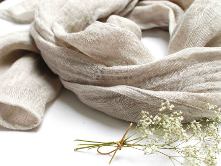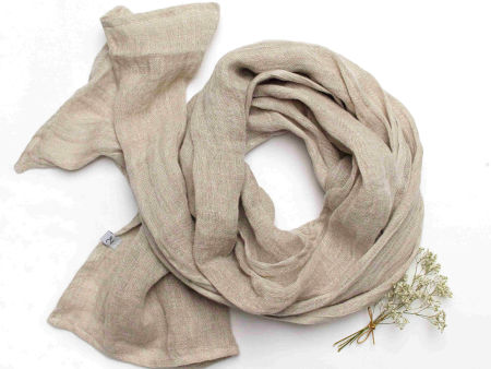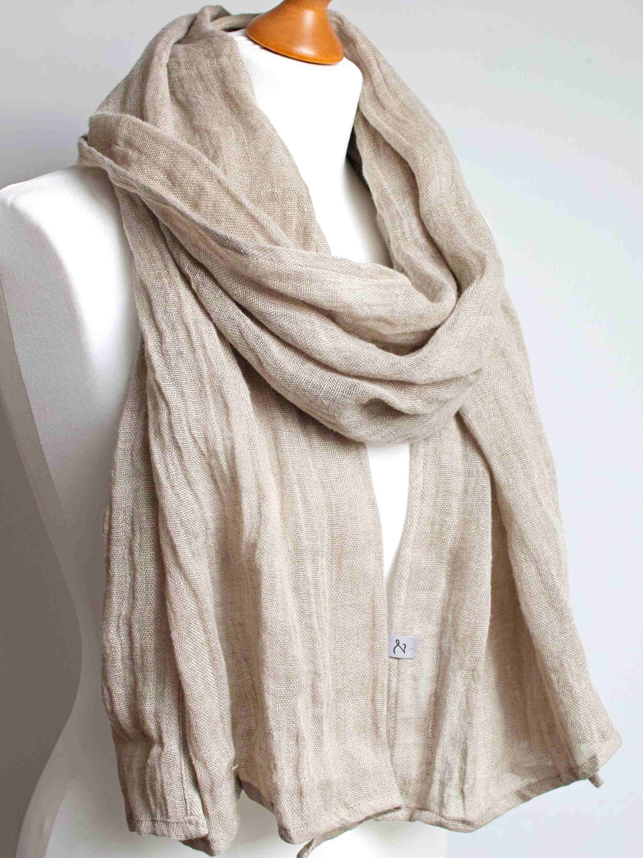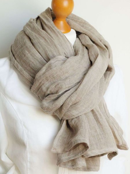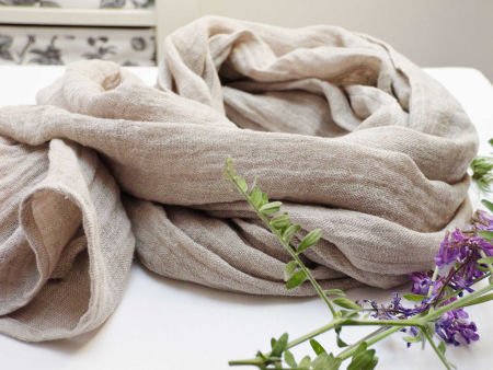 Duży szal z naturalnego, delikatnego lnu. Szal jest miły i miękki w dotyku, bardzo ładnie się układa, jest puszysty. Brzegi zostały estetycznie wykończone, przeszyte maszynowo.