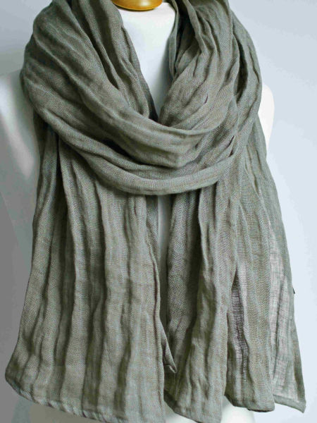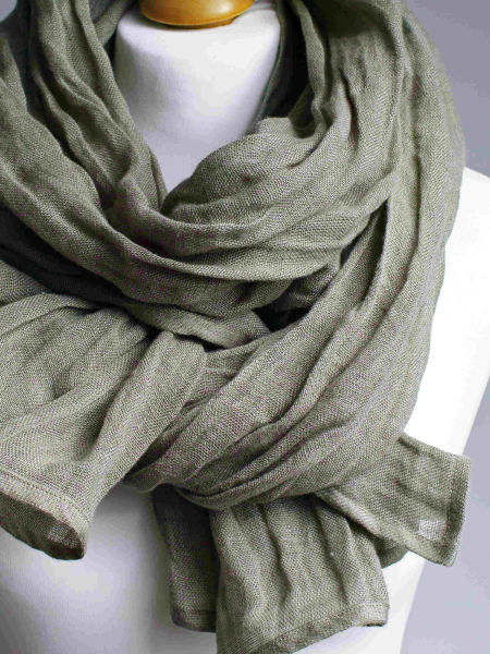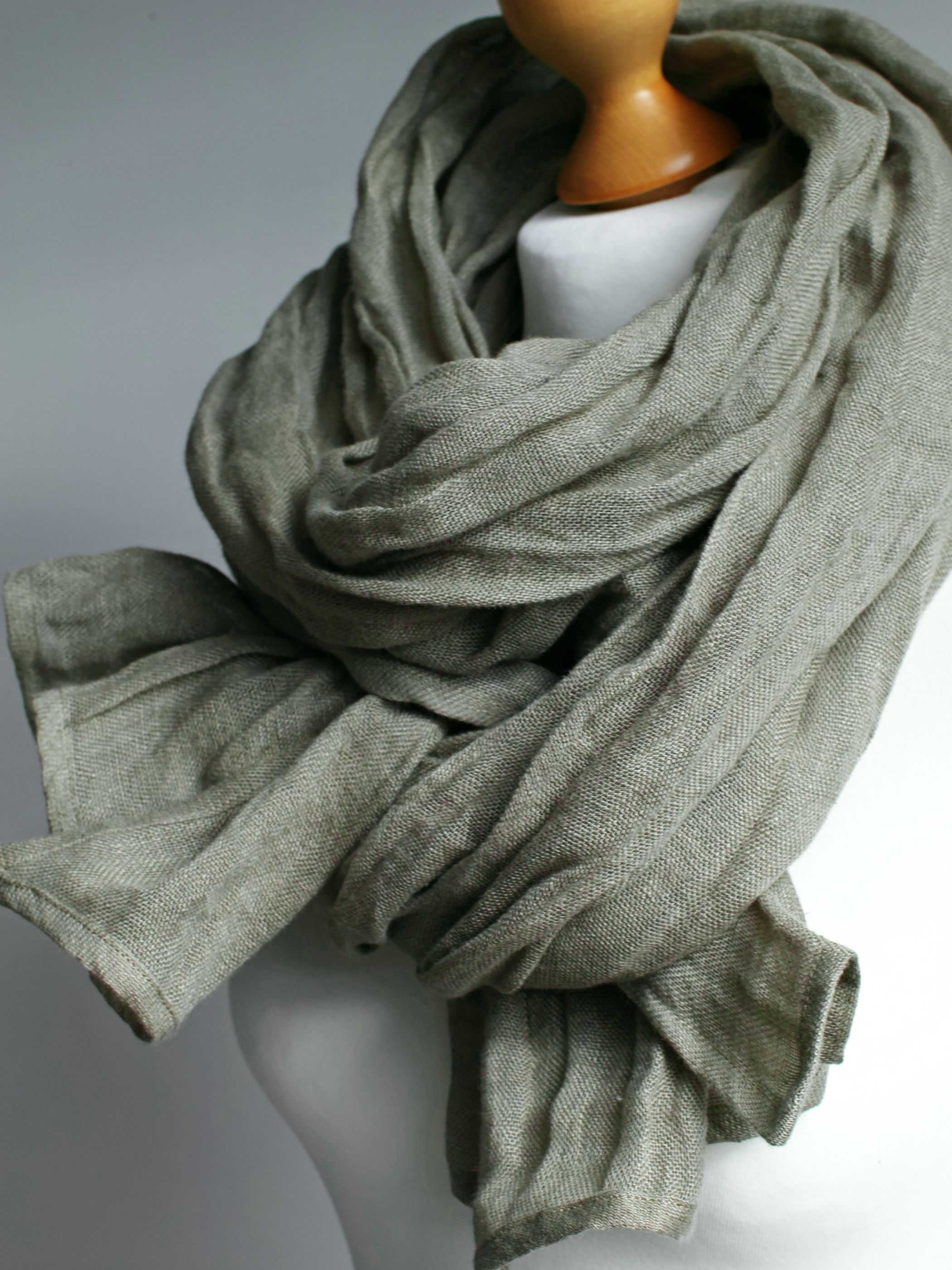 Duży, obszerny szal z naturalnego, delikatnego lnu. Szal jest miły i miękki w dotyku, bardzo ładnie się układa, jest puszysty. Brzegi zostały estetycznie wykończone, przeszyte maszynowo.