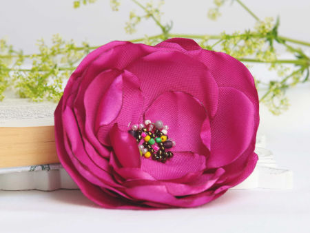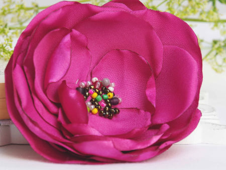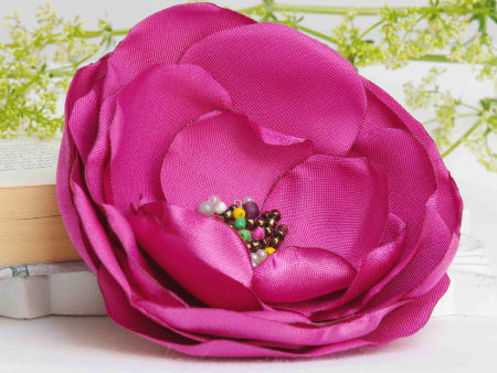 Elegancka broszka, kwiatek ręcznie wykonana z satyny, dodatkowo ozdobiona małymi koralikami. Bardzo efektowny dodatek do marynarki, komina, sukienki, itd. Kwiatek posiada zapięcie broszkowe.