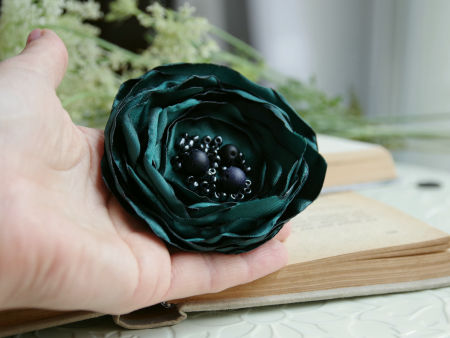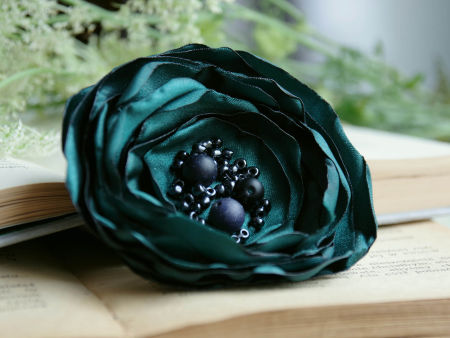 Elegancka broszka, kwiatek ręcznie wykonana z satyny, dodatkowo ozdobiona małymi koralikami. Bardzo efektowny dodatek do marynarki, komina, sukienki, itd. Kwiatek posiada zapięcie broszkowe.