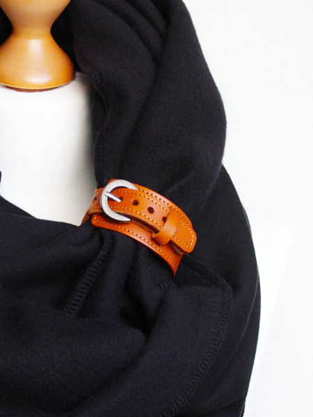 Dodatkową ozdobą jest skórzana zapinka,  która pozwala na regulację i dopasowanie, dodając akcentu stylowego. Zapinka podkreśla indywidualny charakter,  jednocześnie  można nosić do dowolnego szala, komina lub jako ciekawą bransoletkę.