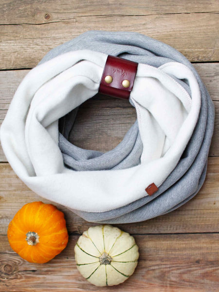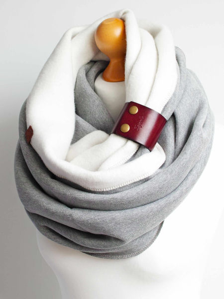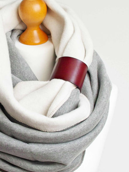 Dodatkową ozdobą jest skórzana zapinka, która pozwala na regulację i dopasowanie, dodając akcentu stylowego. Zapinka podkreśla indywidualny charakter, jednocześnie można nosić do dowolnego szala, komina lub jako ciekawą bransoletkę.