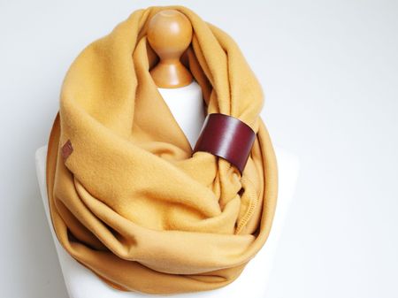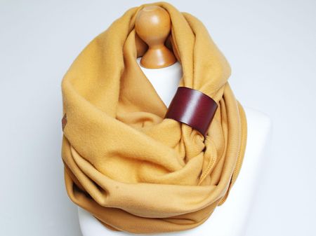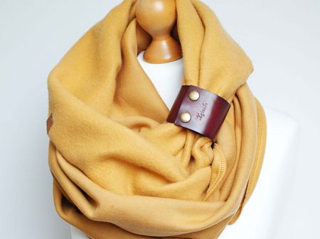 Dodatkową ozdobą jest skórzana zapinka, która pozwala na regulację i dopasowanie, dodając akcentu stylowego. Zapinka podkreśla indywidualny charakter, jednocześnie można nosić do dowolnego szala, komina lub jako ciekawą bransoletkę.